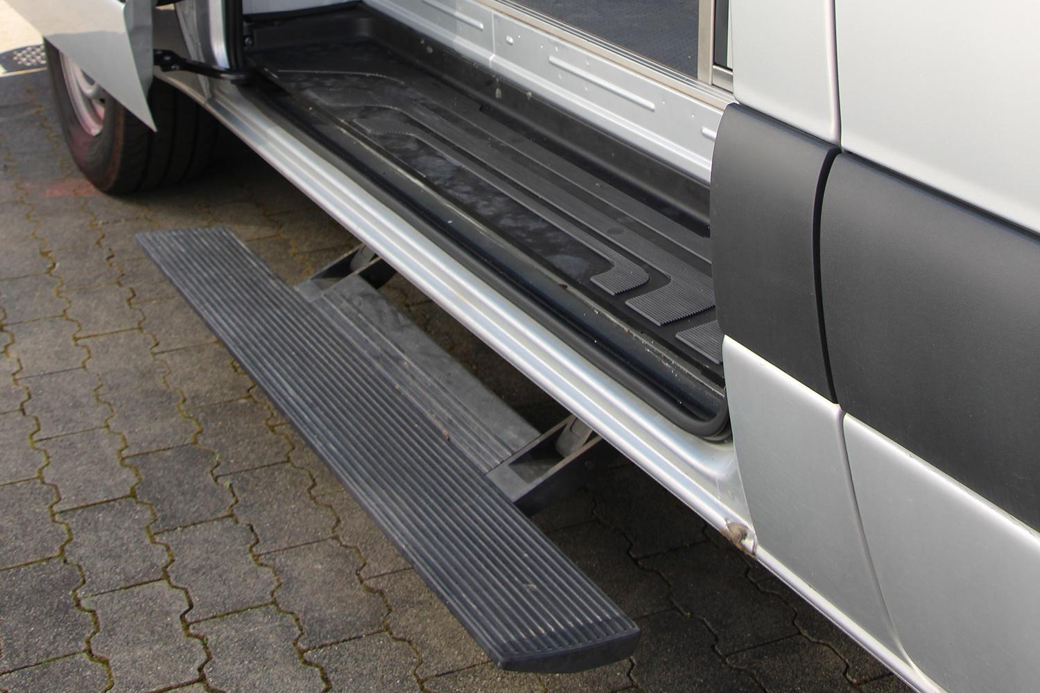 Bei einem hohen Radstand kann der seitliche Zugang zu Ihrem Fahrzeug im Arbeitsalltag zu einem Problem werden. Wir bieten Ihnen einfache oder automatische seitliche Trittstufen für Ihr Fahrzeug. Letztere fahren automatisch bei Öffnen der Türe ein und aus.