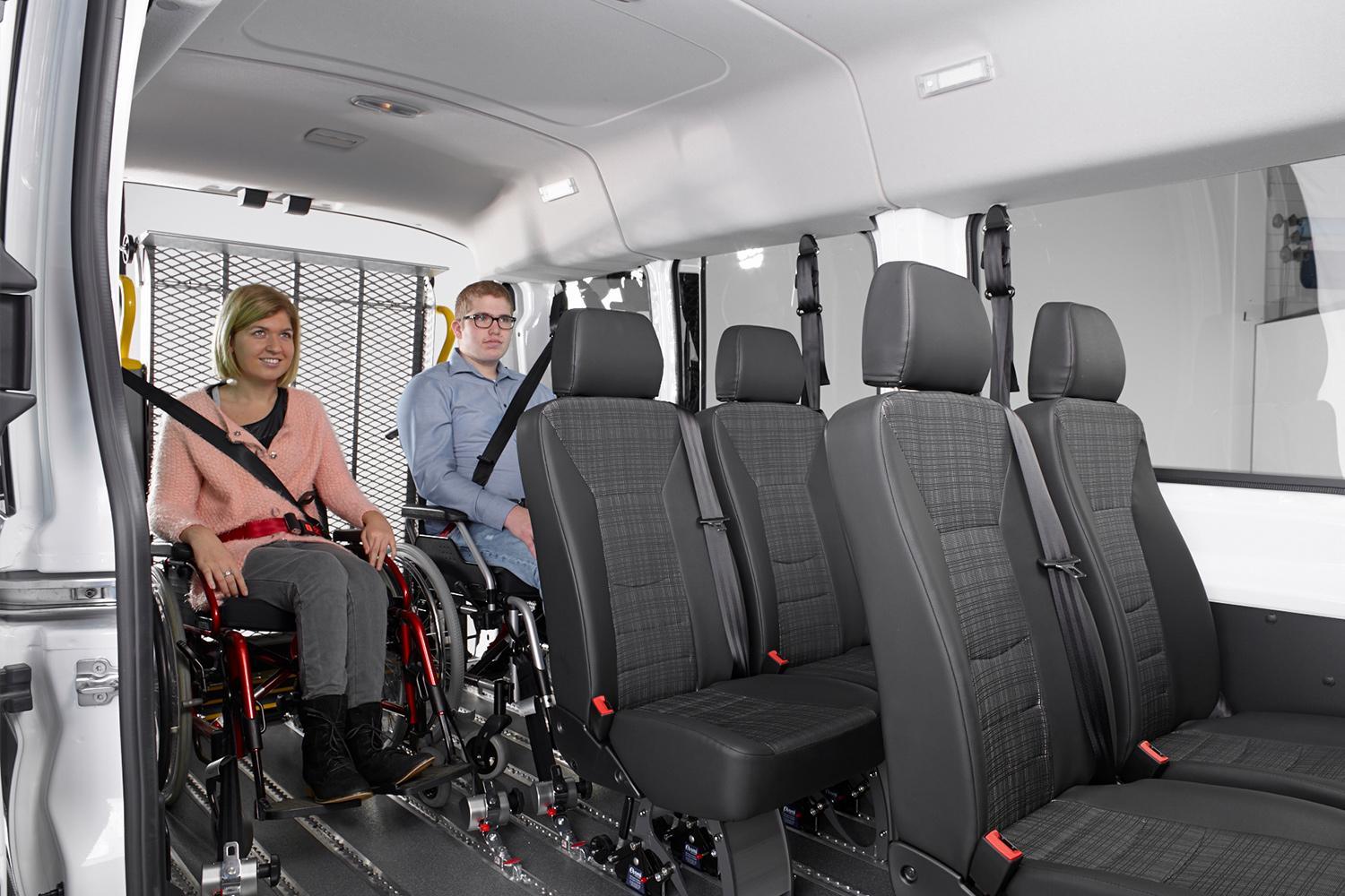 Durch den Heckausschnitt kann der Rollstuhlfahrer bequem ins Fahrzeug befördert werden. Die rutschsichere Rampe ermöglicht dem Rollstuhl eine einfache Einfahrt ins Fahrzeug und mit der tiefergelegten Bodenwanne entsteht viel Platz im Fahrgastraum. Ein Personen- & Rollstuhlrückhaltesystems wird am Rollstuhl und am Fahrzeugboden befestigt und die Person gesichert. Die Kopf- und Rückenstütze „FutureSafe“ bietet extra Schutz.